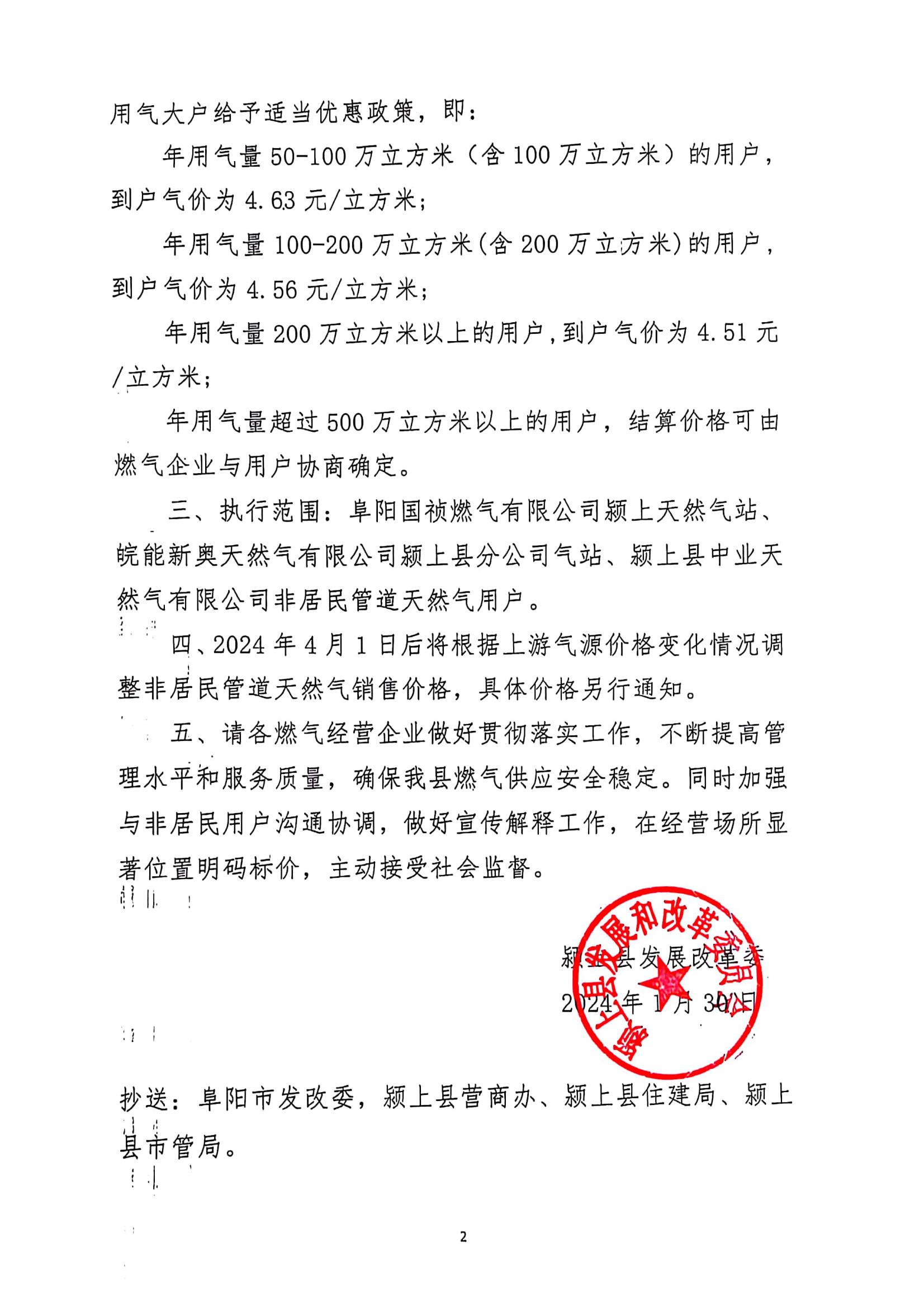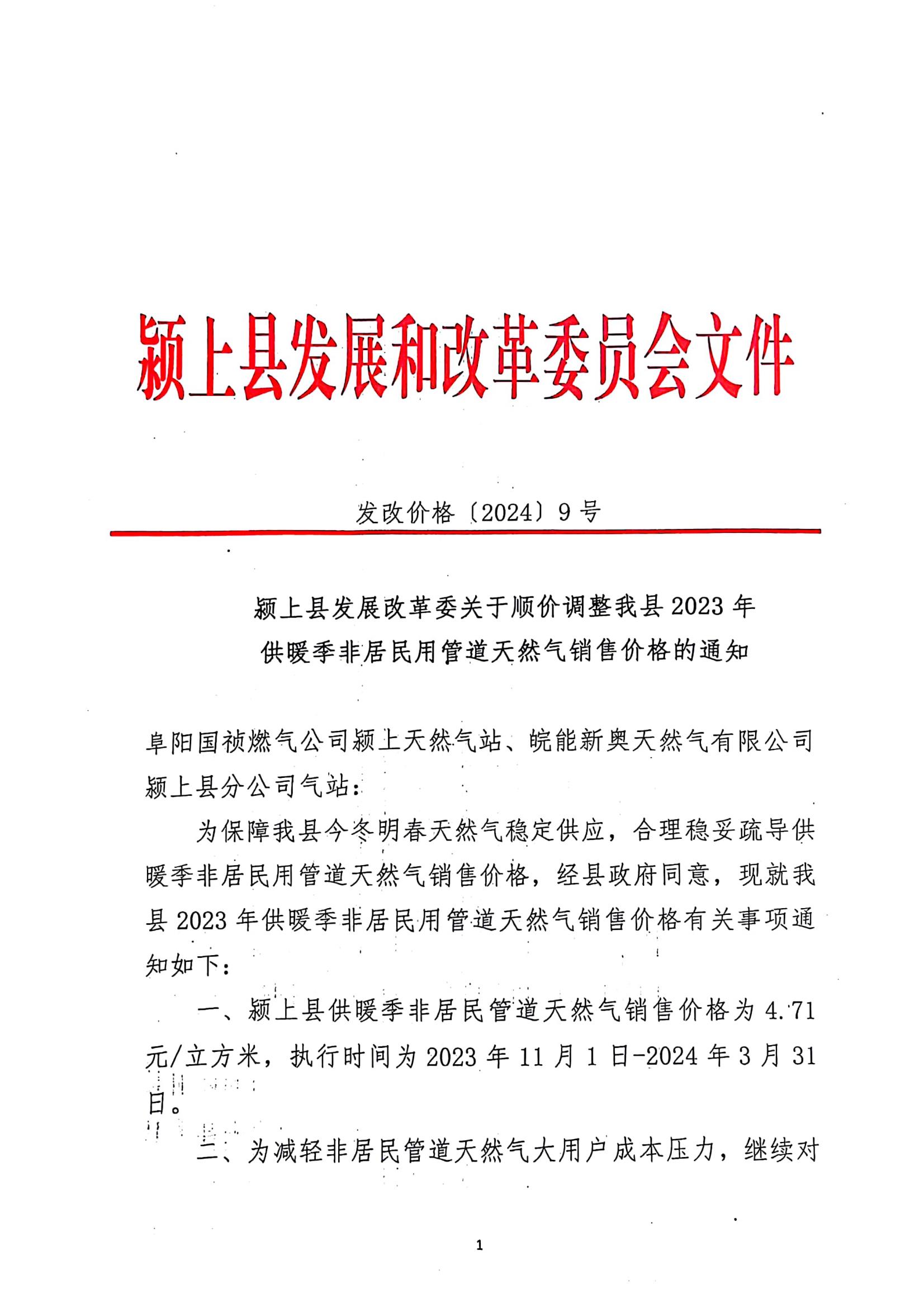 潁上縣發(fā)展改革委關(guān)于順價調(diào)整我2023年供暖季非居民用管道天然氣銷售價格的通知