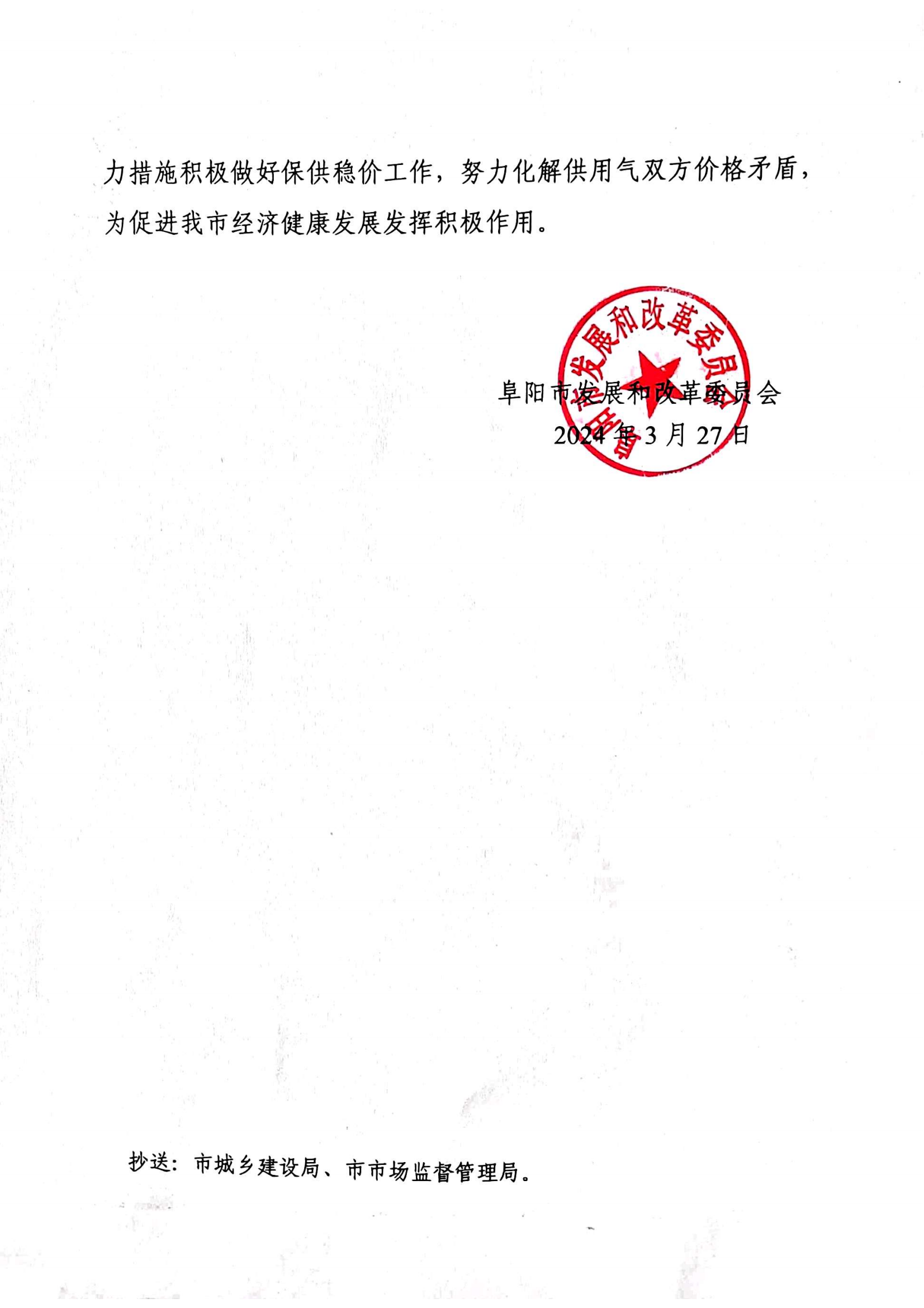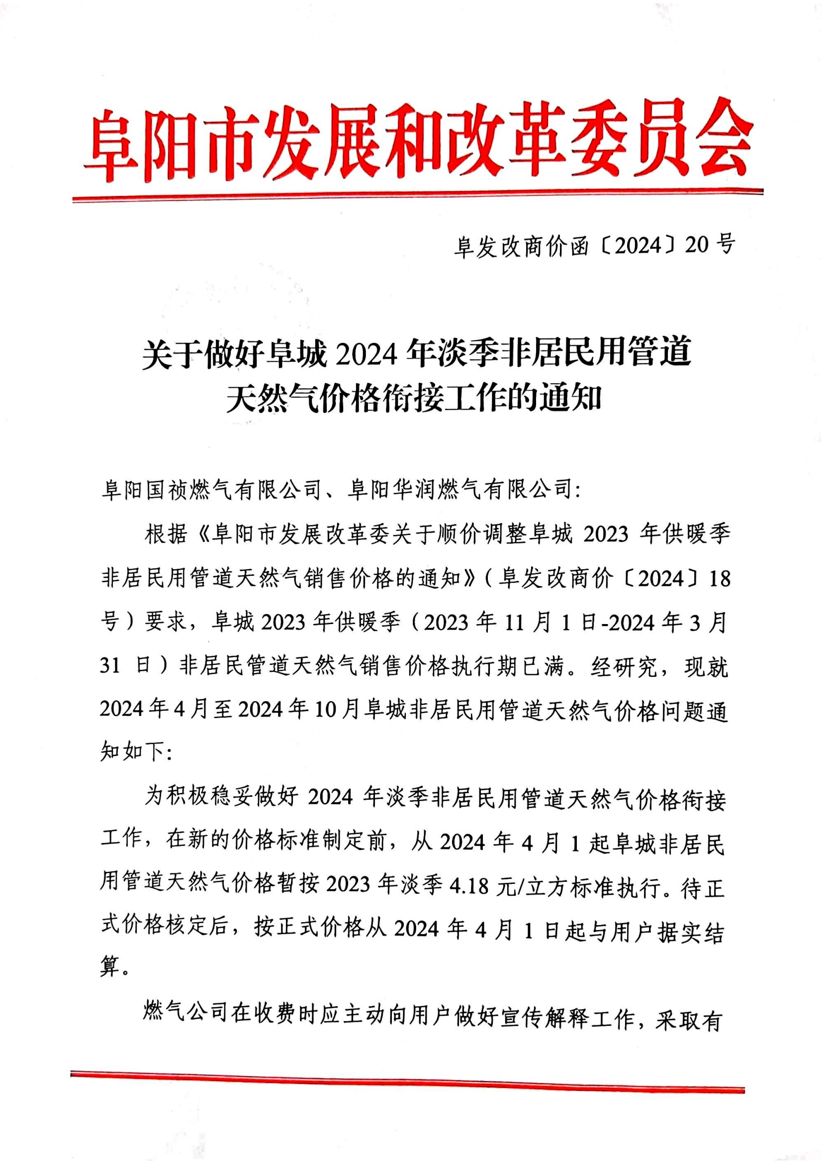 關(guān)于轉(zhuǎn)發(fā)阜陽市發(fā)改委《關(guān)于做好阜城2024年淡季非居民用管道天然氣價(jià)格銜接工作的通知》