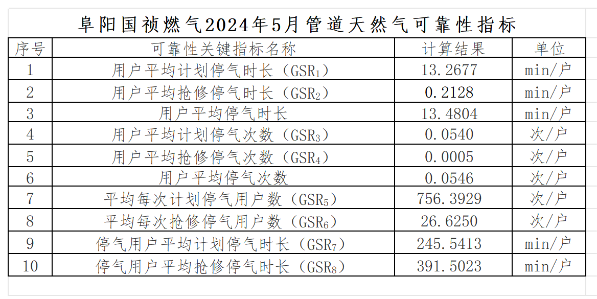 2024年5月阜陽國禎燃氣有限公司供氣可靠性關鍵指標數據