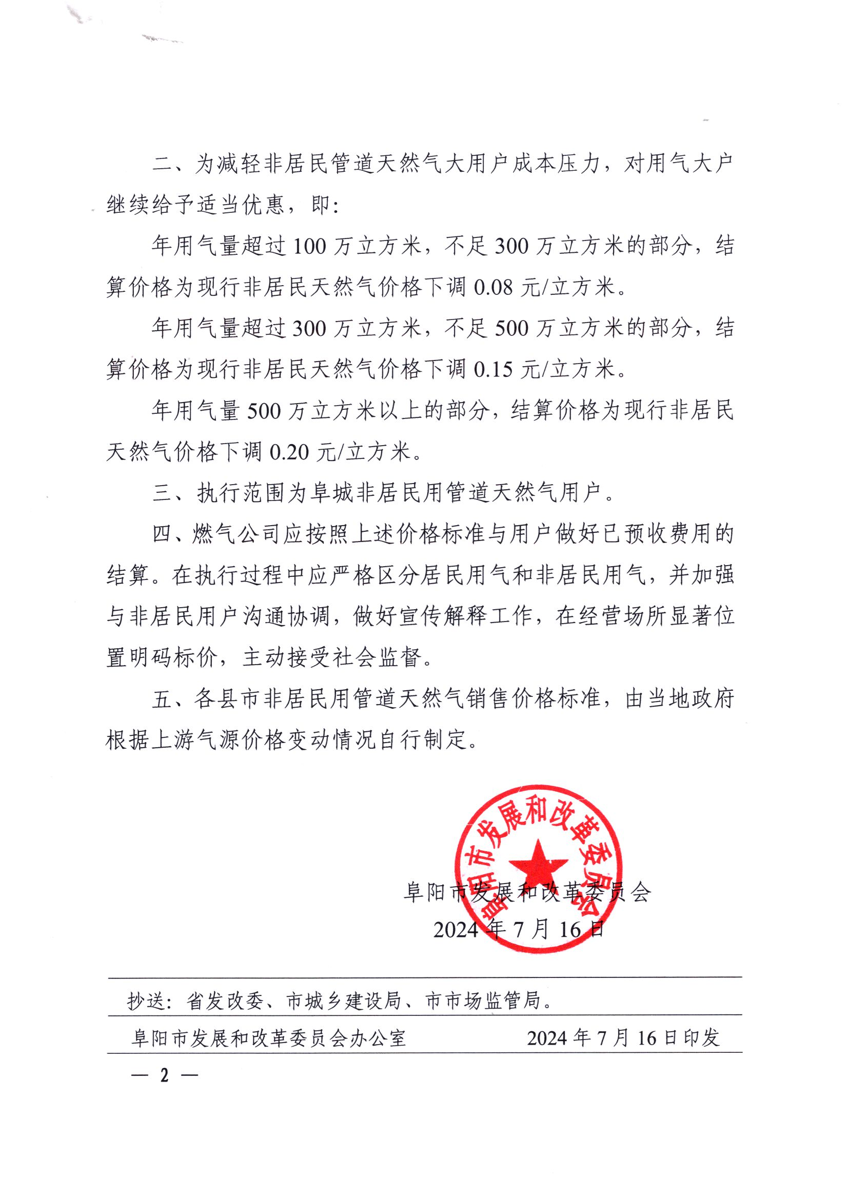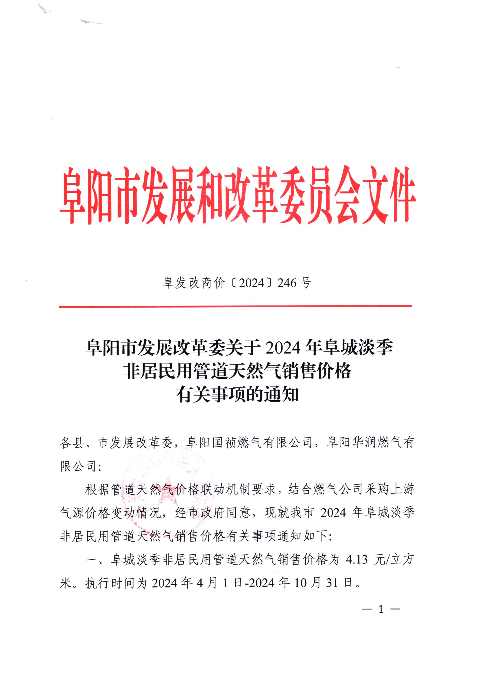 阜陽市發(fā)改委關于2024年阜城淡季非居民用管道天然氣銷售價格有關事項的通知