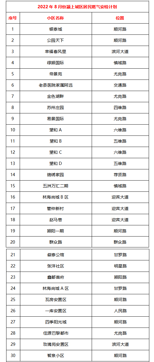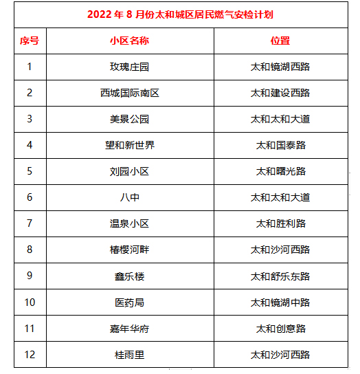 尊敬的阜城燃?xì)庥脩簦簽榱吮U夏纳敭a(chǎn)安全,燃?xì)庠O(shè)施的運行安全及正常供氣。我公司將于8月份擬對下列小區(qū)進(jìn)行燃?xì)馊霊舭踩珯z查,請廣大燃?xì)庥脩舴e極配合并相互轉(zhuǎn)告。小區(qū)明細(xì)如下: