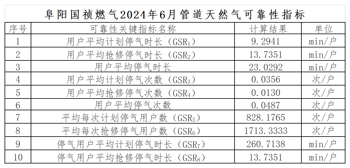 2024年6月阜陽國禎燃氣有限公司供氣可靠性關(guān)鍵指標數(shù)據(jù)