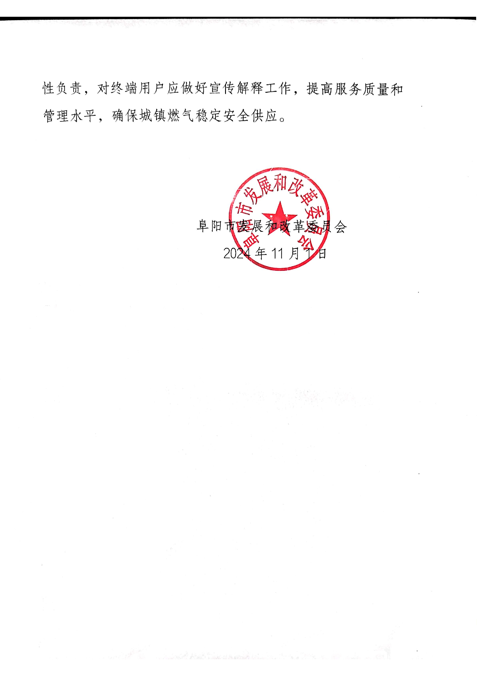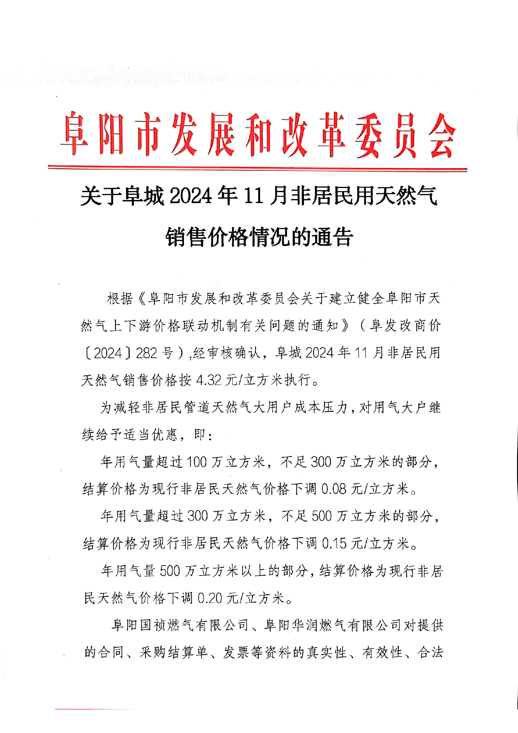 阜城2024年11月非居民用天然氣銷售價格情況的通知