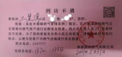 當(dāng)您回到家中,發(fā)現(xiàn)您的家門口有一張到訪不遇的貼紙時(shí)(下圖),那是根據(jù)《阜陽(yáng)城鎮(zhèn)燃?xì)夤芾項(xiàng)l例》規(guī)定,安檢員到那您家中定期檢查,到訪后您家中無人,請(qǐng)您回家后及時(shí)和我司聯(lián)系,或者因特殊原因錯(cuò)過安檢,您可以預(yù)約安檢時(shí)間,為了保證安全用氣,請(qǐng)及時(shí)與我公司安檢人員聯(lián)系。