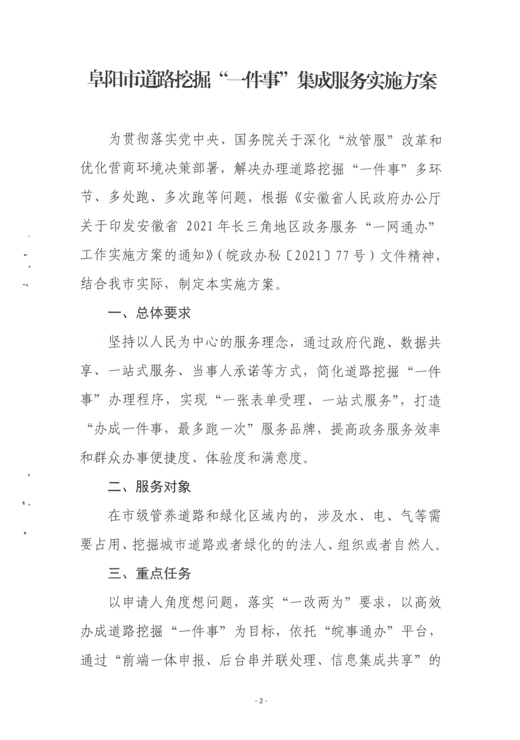關(guān)于印發(fā)《阜陽市道路挖據(jù)“一 件事”集成服務(wù)實(shí)施方案》的通知