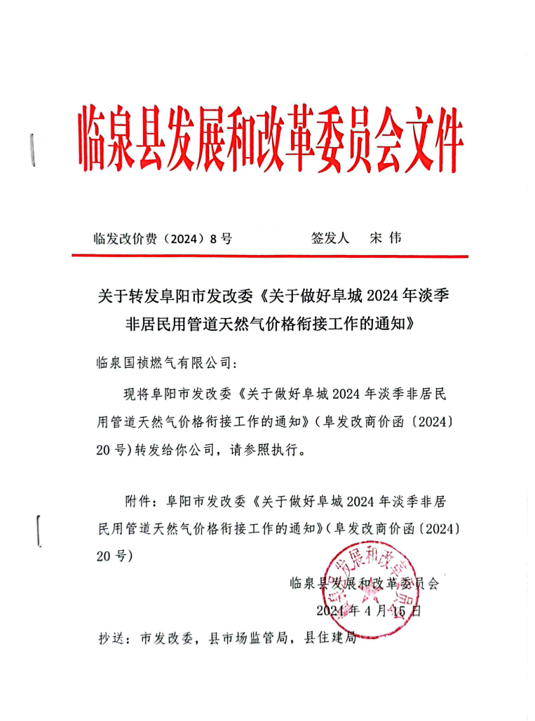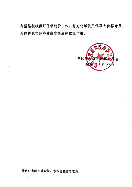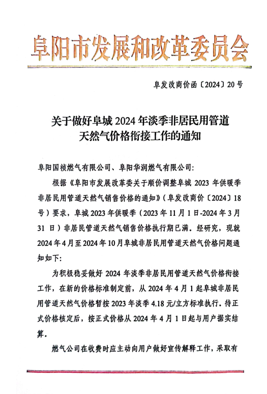 阜陽市發(fā)改委關于2024年阜城淡季非居民用管道天然氣銷售價格有關事項的通知